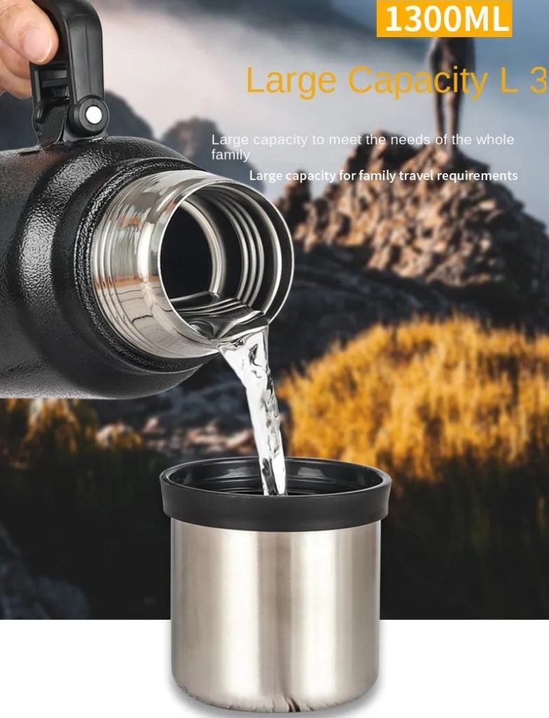 This flask is suitable for a Nursing mother, Office worker, Student, Business personnel, etc? Do you like Hiking, Going to the Gym/Sports, or Going on Trips... This 1300ml vacuum flask is ideal for you to keep your hot drinks like coffee, tea, pap, or hot chocolate hot 🔥 for several hours. This makes it perfect for people who want to take their drinks to work or on a long trip. This insulated vacuum Flask is very suitable for daily use and can be taken on the go, such as hiking, Biking, Beach, Camping, on trips, to School, or workplaces.